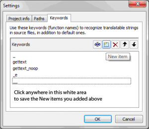 7. Click on Keywords tab. Click on the New item button and add _e (underscore e), then add __ (double underscores) and click the OK button. Very Important! After typing in the _e and __ New items you need to click anywhere in the white area below just like you did on the Paths tab to save your path. The blue box should disappear, which will indicate that both of your New items are saved.